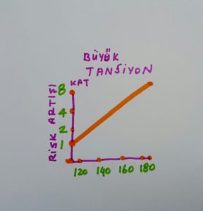 2.115 mmHg’dan sonra her 20 mmHg’lık yükselme riski 2 katına çıkarmaktadır yani büyük tansiyonu 135 mmHg olanın riski 115 mmHg olana göre 2 kat artmıştır.
